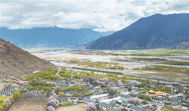 四月,藏东南河谷桃花初绽,车窗外雪山与桃林交相辉映,拉林铁路列车穿行在桃花掩映的尼洋河畔,绘就高原独有的春之画卷。