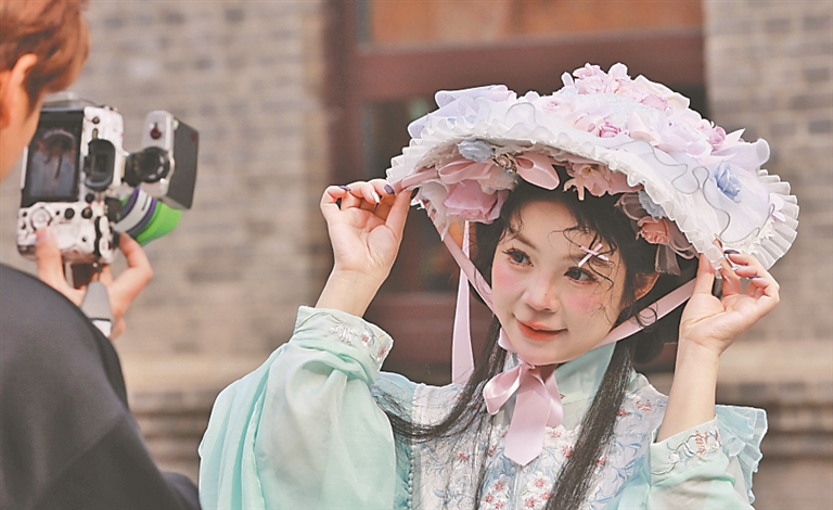 四日,哈尔滨市道外区中华巴洛克历史文化街区内,游人旅拍打卡。 本报记者 张澍摄