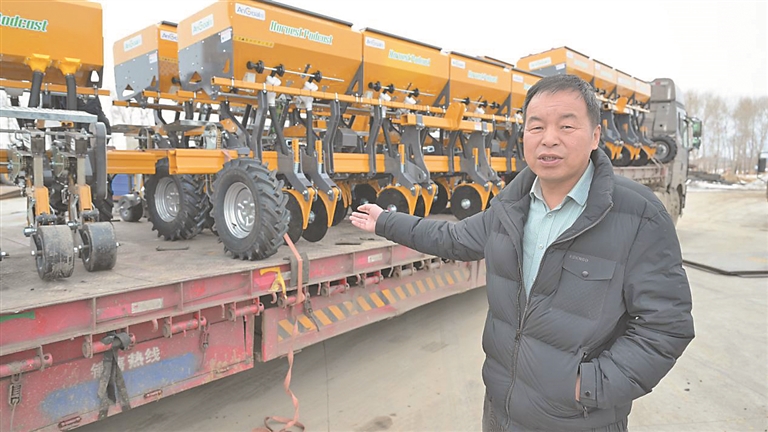 3月26日,位于爱国村的黑龙江爱国智能科技有限公司院内,前来购买农机的农户络绎不绝,发往外地经销商的农机具也正在抓紧装车。