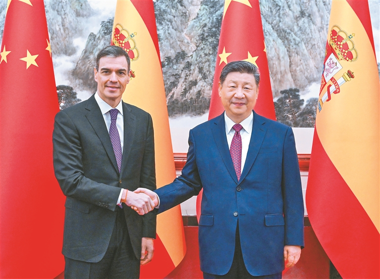 习近平强调,风物长宜放眼量。中西友好是两国人民基于传统友谊、现实需要、长远利益作出的正确抉择。双方要继续巩固相互支持的政治基础,相互信赖、相互尊重,在涉及彼此核心利益和重大关切问题上相互支持,特别是支持彼此维护主权和领土完整。中国14亿多人口的消费升级需求和产业转型潜力,将为世界经济提供强劲动力。中方愿同西班牙用好互利互补的合作优势,发挥好经贸、科技合作机制作用,深挖新能源、高技术制造业、智慧城市等领域合作潜力,打造更多互利合作成果。要赓续相知相亲的友好传统,传承好两国人民深厚的“奥运情”、“熊猫情”,打造“欢乐春节”等新的“金字招牌”,扩大互派留学生规模,让更多青年成为中西友好的生力军。中西都是支持多边主义和开放合作的积极力量,双方要推动构建公正合理的全球治理体系,维护世界和平和安全,促进共同发展繁荣。