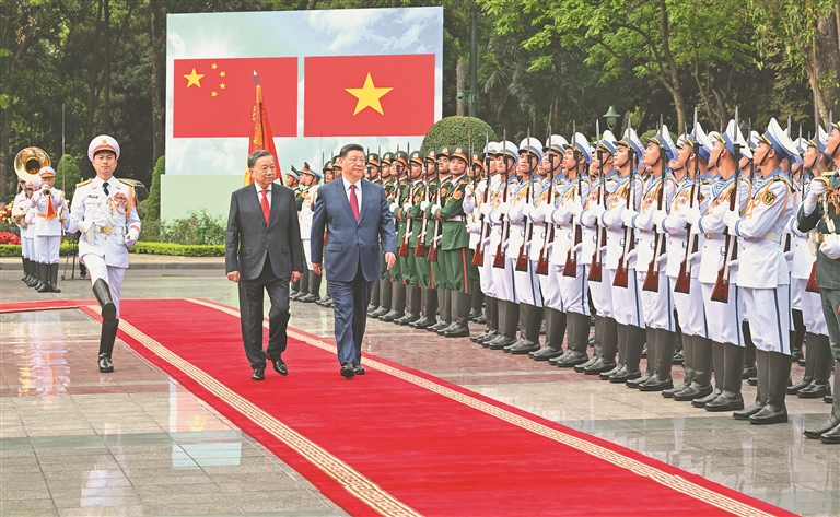 新华社河内4月14日电(记者郑开君 胡佳丽)4月14日,中共中央总书记、国家主席习近平抵达河内对越南进行国事访问。当日下午,越共中央总书记苏林为习近平举行隆重欢迎仪式。