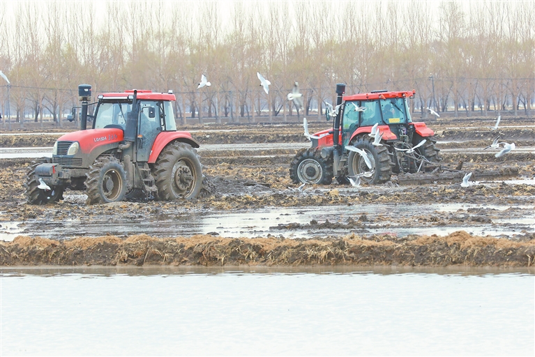 水田泡田平地作业。刘玉峰摄