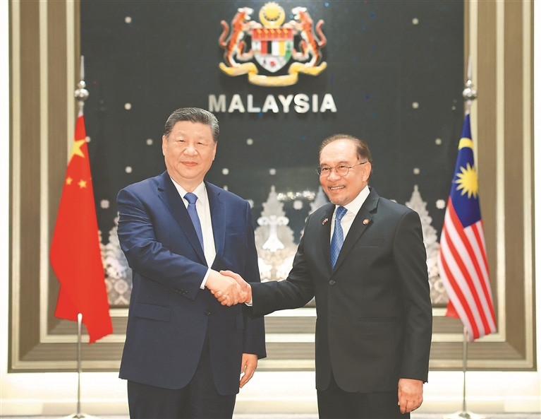 二是凝聚发展合力,打造高质量发展合作标杆。中国致力于以高质量发展全面推进中国式现代化,同马来西亚“昌明经济”计划异曲同工。双方要携手培育壮大数字经济、绿色经济、蓝色经济、人工智能等前沿合作,加强产业链、供应链、价值链、数据链、人才链融合发展。推动传统领域合作转型升级,促进双向投资。推进铁海联运,实现“两国双园”提质升级,将马来西亚重要港口打造成“陆海新通道”重要枢纽。