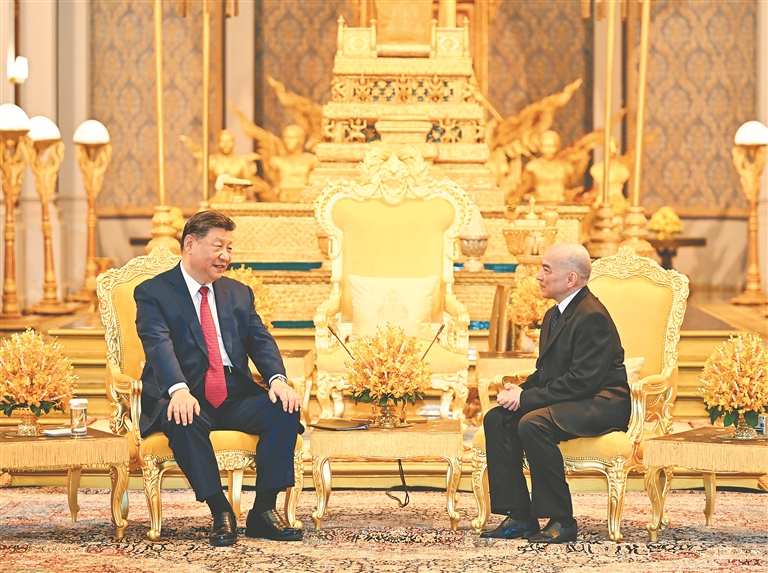 习近平强调,中方珍视同柬埔寨王室的友谊,高度评价多年来柬王室为中柬友好事业作出的重要贡献。新形势下,中柬双方要珍惜并传承中国老一辈领导人和西哈努克太皇共同缔造的中柬铁杆友谊,赋予中柬命运共同体新的时代内涵,服务各自国家发展和人民福祉,为构建周边命运共同体、推动构建人类命运共同体作出更大贡献。中方坚定支持柬埔寨保持稳定、加快发展、改善民生,走符合本国国情的发展道路,相信中国式现代化将为柬埔寨等周边国家带来更多机遇,相信构建新时代全天候中柬命运共同体一定会谱写壮丽篇章。