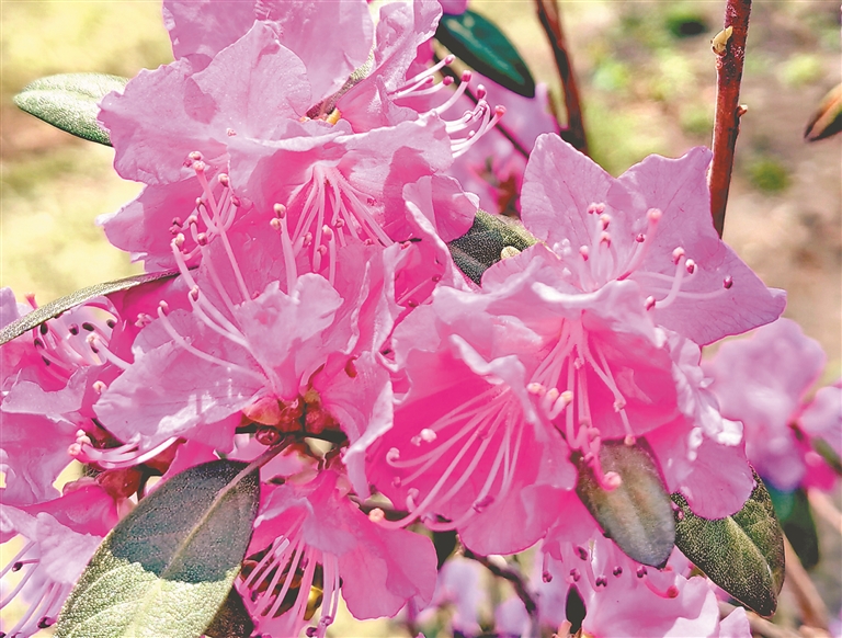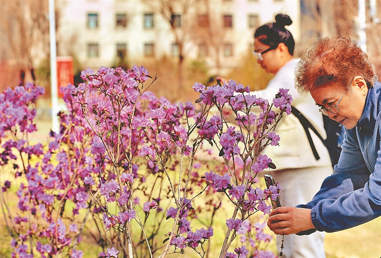 4月19日,哈尔滨工程大学校园内,绿地里的兴安杜鹃陆续开花。