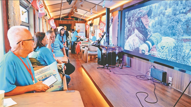 游客在“伊春号”旅游专列上观看电影。图片由中国铁路哈尔滨局集团有限公司提供