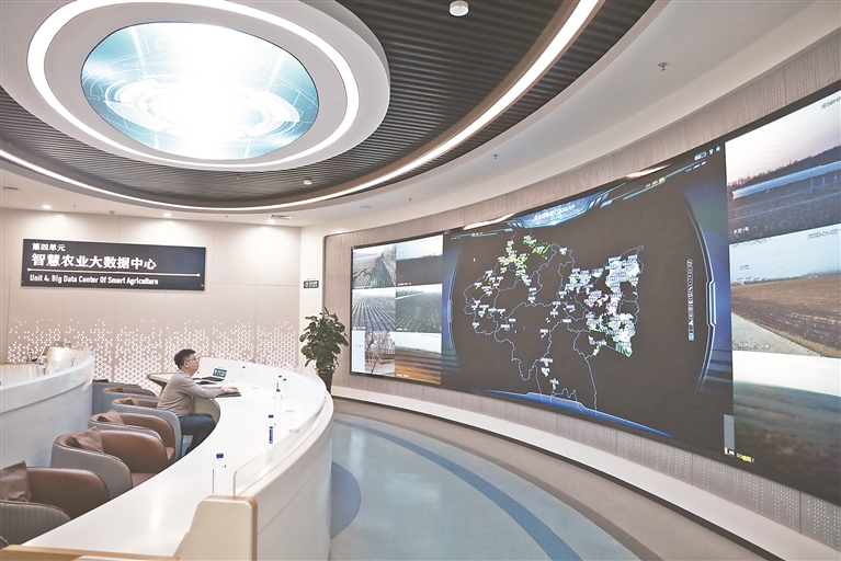 位于智慧农业农机中心二楼的数字平台是七星农场的“大脑”,通过集成5G、大数据等新技术,实现了对农作物生长全过程的精准管理。