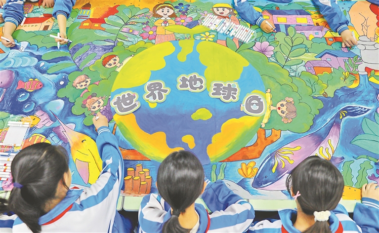 下图:4月21日,河北省秦皇岛市海港区先盛里小学学生在手绘环保长卷。新华社发