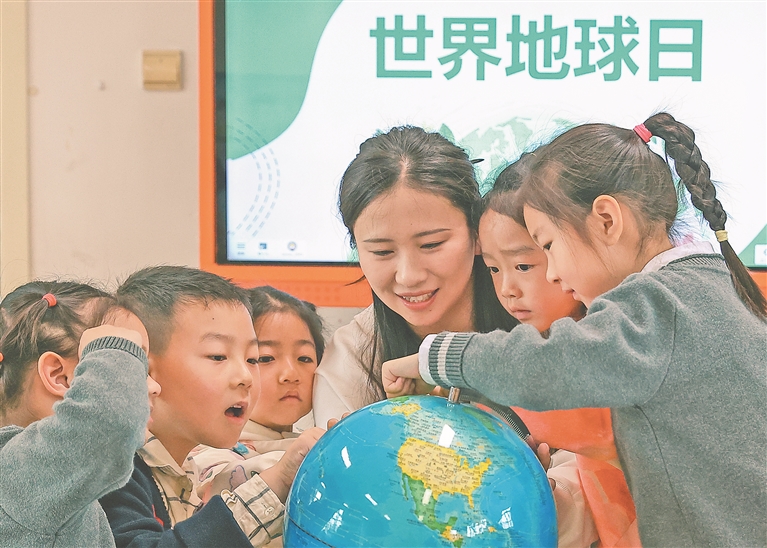 上图:4月21日,在江苏省镇江市丹徒区驸马山庄幼儿园,老师指导孩子们认识地球仪。