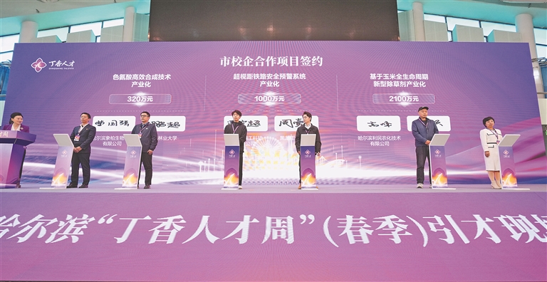 市校企协同育才“握指成拳”。2024年,“丁香人才发展联盟”组建,这是对《人才新政30条》“建立市校联合办公机制”的深化拓展,首批60家联盟成员从1000余家单位中筛选出部分高校、科研院所、行业领军企业与市委人才办共同组成。新政实施以来,哈市各级企事业单位同省内外高校新签约实习实训、成果转化等合作项目612个,与中国学位与研究生学会签订创新实践大赛5年协议,共建创新实践成果孵化基地。在政策支持下,2024年,哈市与哈尔滨工程大学、东北农业大学共同承办人工智能和乡村振兴领域主题赛事,以国内顶级创新赛事为“媒”,搭建海内外青年人才交流引进平台,推动“四链”深度融合发展,加快构筑向北开放人才“新高地”。
