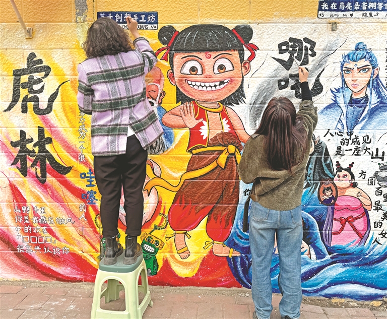 艺术工作者彩绘墙面。本报记者 孙伟民摄