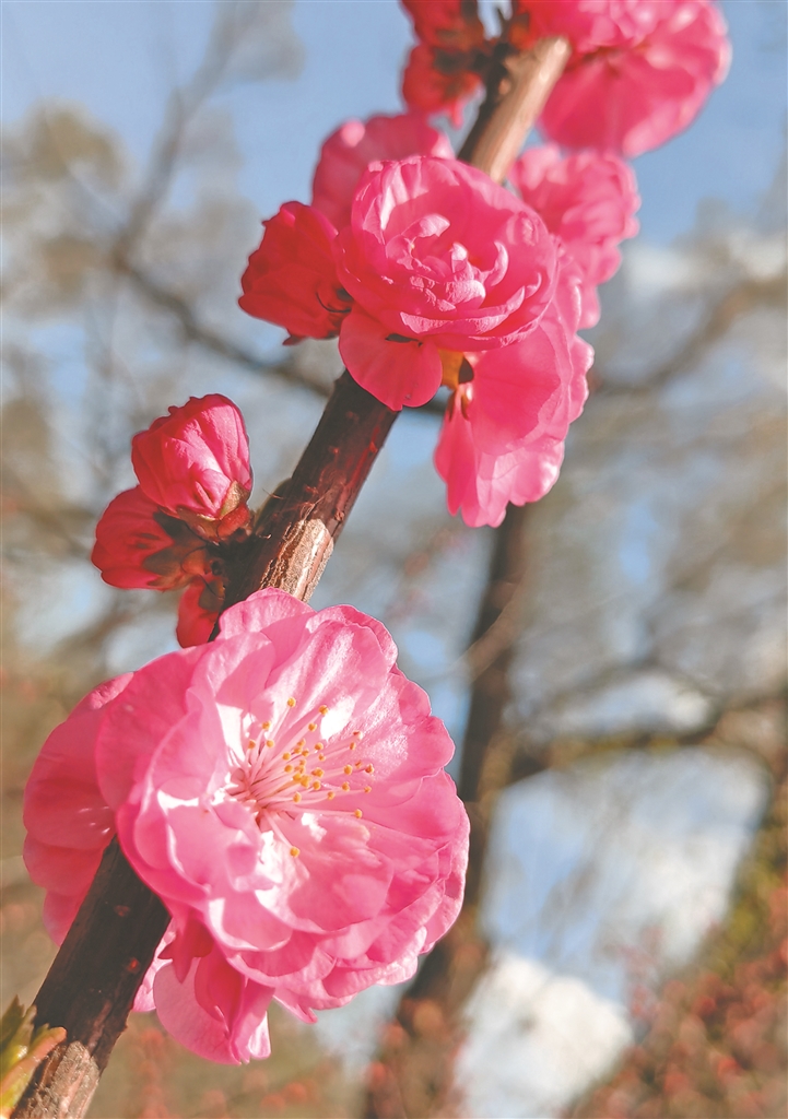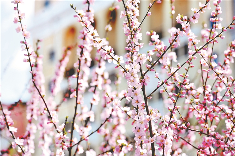 4月24日,哈尔滨市兆麟公园内,一株单瓣榆叶梅的粉色花朵竞相绽放,吸引许多游人上前拍照。不远处,多株重瓣榆叶梅枝头上已缀满了红色花朵和含苞待放的花蕾。