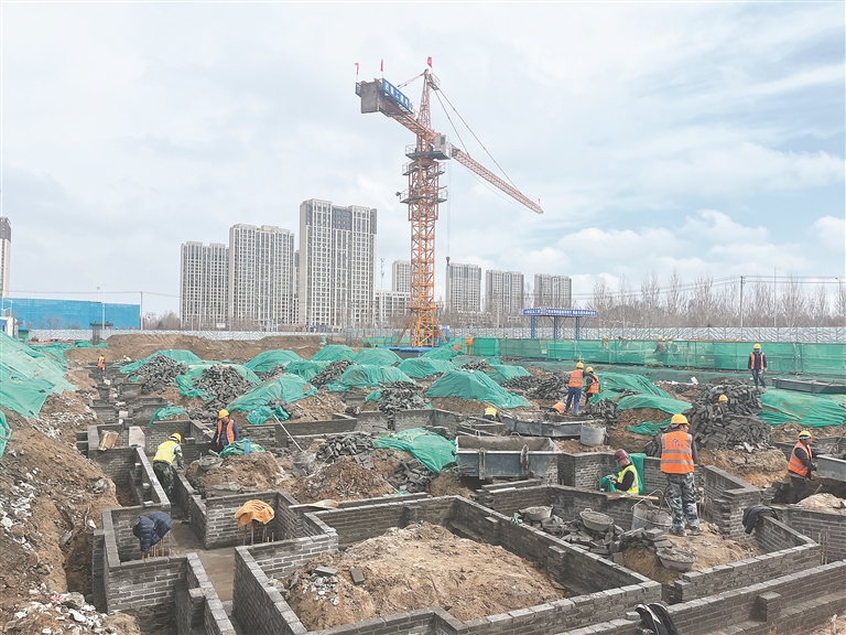 记者在香坊区前进村城中村改造项目安置房施工现场看到,伴随着隆隆机声,数台挖掘机和铲车正按指挥对基坑进行精细处理,大型运输车在基坑便道上来回穿梭,钢筋工熟练地绑扎着钢筋。