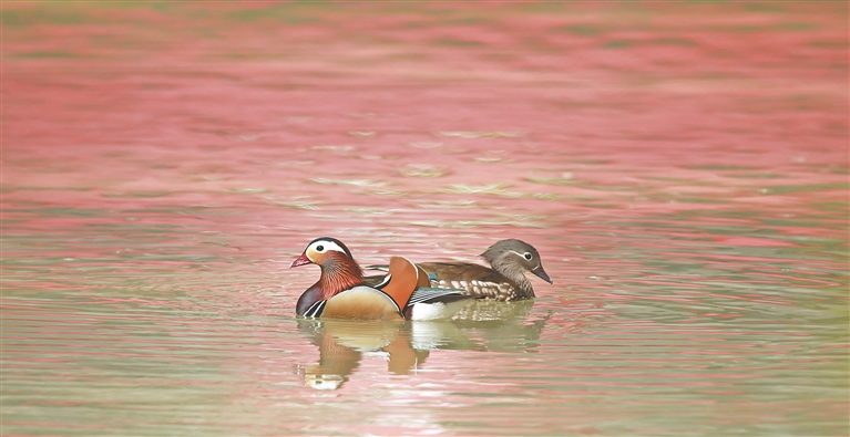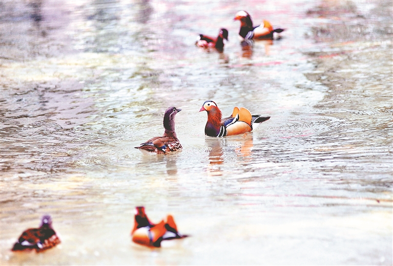 4月25日,哈尔滨市兆麟公园对鸳鸯湖进行了今年首次放水,吸引来百余只野生鸳鸯戏水觅食。公园工作人员介绍,因湖岸维修,今年放水时间晚于常年。开春时迁徙来的鸳鸯一直在公园的树上、假山活动,工作人员不间断进行人工投喂。“五一”假期这里也会成为市民赏鸟游玩的一个好去处。 本报记者 苏强 张澍摄