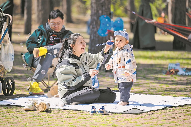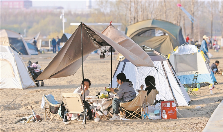 日前,不少市民来到哈尔滨大剧院湿地露营,享受春光。沙滩上、树荫下,孩子们尽情嬉戏玩耍,大人们在一旁野餐聊天。