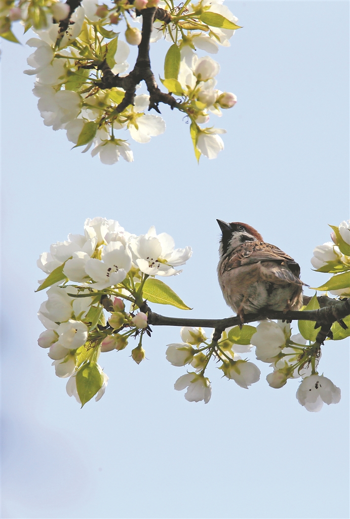 近日,哈尔滨市古梨园中139年树龄的老梨树悄悄绽放,洁白的花朵如片片雪花落满枝头。树旁,不少市民打卡拍照,定格这一树烂漫的春光。