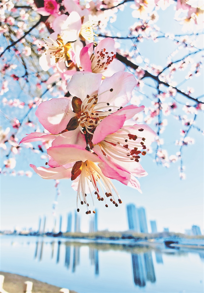 连日来,随着气温上升,齐齐哈尔市劳动湖风景区(齐大段)湖畔边山桃花、连翘花竞相开放,将景区装扮得如诗如画,引来不少游人前来赏花“打卡”。