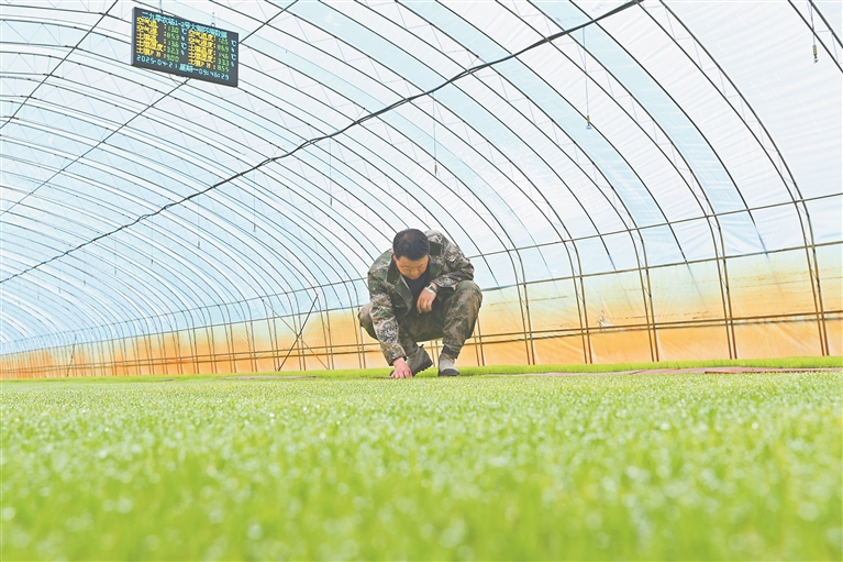 在工厂化育秧基地内,满眼翠绿色的秧苗长势良好,分布在每个秧棚内的16个传感器,正实时采集棚内10余项重要数据的变化情况。“传感器将数据汇总到‘智慧’控制终端,秧棚就可以通过微调电机自主控水控温,动态育秧保秧了。”基地管理人员葛立新介绍,接近100%的壮秧率,让基地产出的秧苗成为了种植户炙手可热的抢手货。