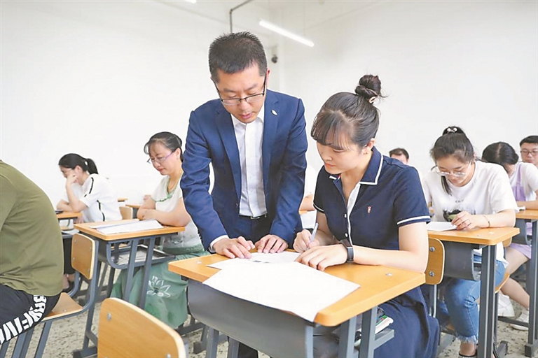 哈尔滨理工大学自动化学院院长胡军(中)在为学生解答问题。