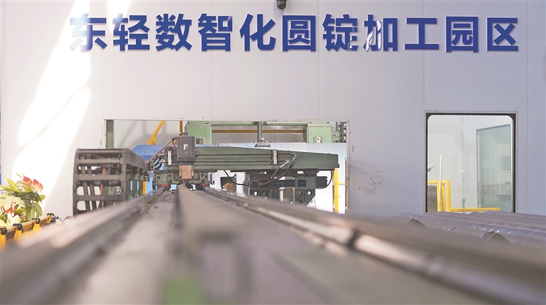 近日,记者走进东轻熔铸厂数智化车间,三台灵动的机械臂正精准配合,首台机械手臂将600℃的炽热圆锭从冷却床平稳转移至锯切区,第二台机械手臂自动完成切头尾、定尺锯切,最后经智能视觉系统检测的合格品由第三台机械手臂整齐码垛。全过程一气呵成,仅需一名操作人员控制数据。