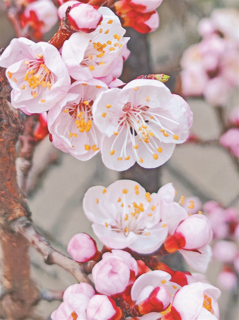 山杏,它朴实无华却饱受人们的喜爱,它分布在我国广袤无垠的土地上,记载在古代治病救人的药典里,闪耀在文人墨客的诗词中。山杏花从深红到粉红,从花心晕染开来,“白白红红两不真,重重叠叠是精神。”一朵朵挤成一簇簇,一簇簇挂满一枝枝,花枝恣意伸展,花朵竞相开放,花瓣密密匝匝,在哈工程校园里形成一道百多米长的杏花长廊。