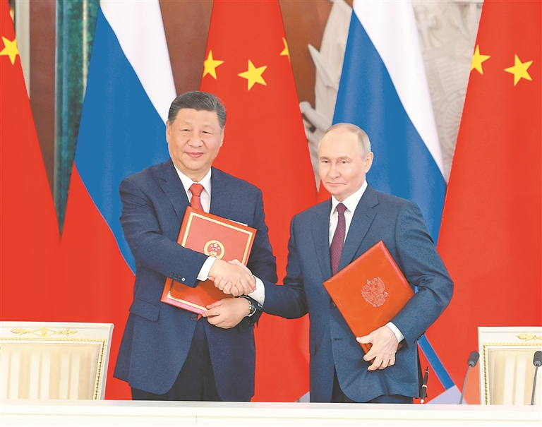 习近平指出,刚才,我同普京总统举行了深入友好、富有成果的会谈,达成许多新的重要共识。我们共同签署《中华人民共和国和俄罗斯联邦在纪念中国人民抗日战争、苏联伟大卫国战争胜利和联合国成立80周年之际关于进一步深化中俄新时代全面战略协作伙伴关系的联合声明》,见证两国有关部门交换多份合作文本,为中俄关系发展注入新的动能。