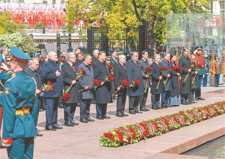 当地时间5月9日,俄罗斯举行盛大庆典,纪念苏联伟大卫国战争胜利80周年。国家主席习近平和来自世界20多个国家及国际组织领导人应邀出席庆典。庆典结束后,习近平同其他国家领导人一起从红场来到亚历山大花园,向无名烈士墓献花,并肃立默哀。新华社记者 翟健岚摄