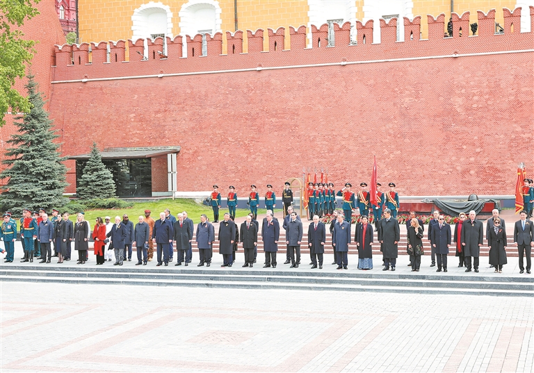 庆典结束后,习近平同其他国家领导人一起从红场来到亚历山大花园,向无名烈士墓献花,并肃立默哀。随后,各国领导人集体合影留念。