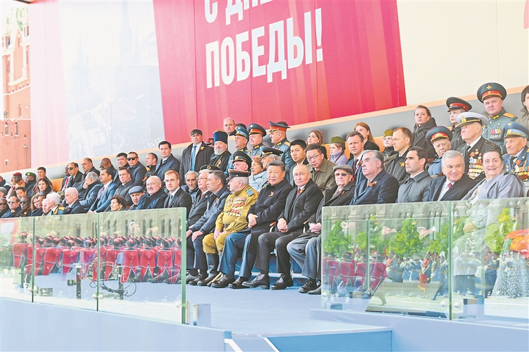 当地时间5月9日,俄罗斯举行盛大庆典,纪念苏联伟大卫国战争胜利80周年。国家主席习近平和来自世界20多个国家及国际组织领导人应邀出席庆典。 新华社记者 谢环驰摄