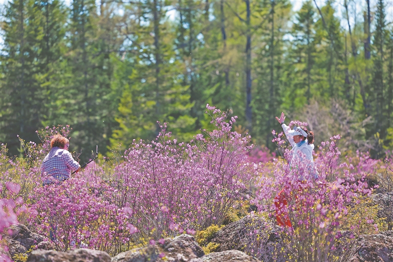 五月的小兴安岭春意盎然,在伊春森工红星林业局公司红星火山地质公园内,兴安杜鹃迎来最佳观赏期。近日,随着第二届伊春·丰林杜鹃花观赏季活动启动,这片独特的火山岩地貌与粉紫色花海交织的奇观,吸引省内外游客慕名而至,成为伊春春日生态旅游的亮点。