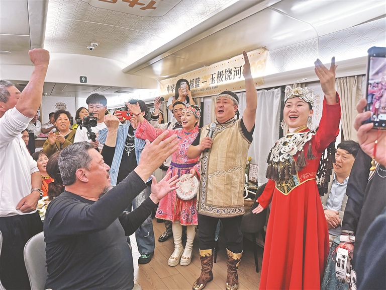 12日6时,“蜜都饶河号”缓缓驶入建三江站。独具特色的赫哲“渔歌舞”、欢快的东北秧歌等精彩的文艺节目轮番上演,迎接远方的客人。游客们跟着节奏扭起了东北秧歌,跳起了赫哲族舞蹈,沉浸式体验民俗文化的独特魅力。