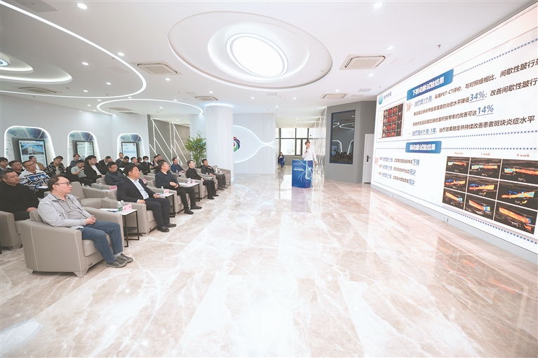 “众所周知,心血管内科最常见、最多发的一种疾病就是动脉粥样硬化。动脉粥样硬化发生在心脑血管系统会引起心梗、脑梗,这在心脑血管疾病中属于急危重症,严重的会有生命危险,发生在外周血管会引起下肢动脉硬化闭塞症、颈动脉斑块引起颈动脉狭窄等疾病,其中下肢动脉硬化闭塞症会影响患者的生活状态,严重的会引起坏疽、溃疡,甚至需要截肢,而颈动脉斑块一旦破裂会形成血栓,引起脑卒中等严重的并发症。”活动伊始,哈尔滨声诺医疗科技有限公司临床研究部部长田浩率先推介。他们带来的动脉斑块声动力智能诊疗系统,利用超声波和声敏剂相结合,针对动脉粥样硬化发病机理进行治疗,适应症为下肢动脉和颈动脉斑块。他介绍,这套国内国际首报的三类医疗器械,是公司通过将哈尔滨医科大学田野教授团队“巨噬细胞靶向声动力疗法治疗动脉粥样硬化斑块”的研究成果落地转化而成,历经四年多的研发、实验、测试,目前设备样机已研制完成。“我们向国家药品监督管理局申报了三类创新医疗器械,目前已经受理,有望成为我省首个获批的三类创新医疗器械。”田浩说。
