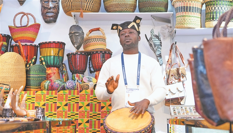 泰国展馆前,冬阴功汤的酸辣香气,玛莎曼咖喱的醇厚、芒果糯米饭的香甜引得客商纷纷驻足品尝。