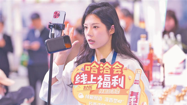 “家人们,这是正宗的哈尔滨红肠,配料表比脸还干净!”主播“东北老肥”的吆喝声回荡在展馆。在今年哈洽会的展馆内,随处可见主播举着自拍杆穿梭,直播间弹幕如雪花般滚动。