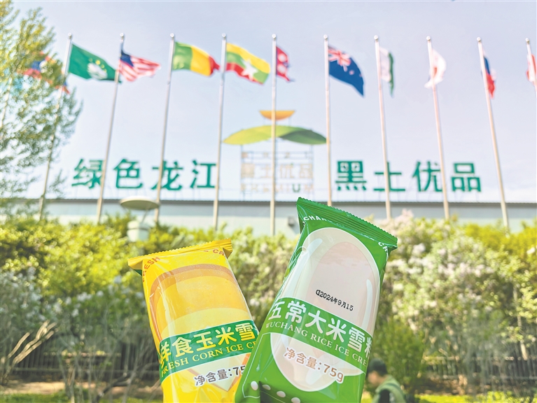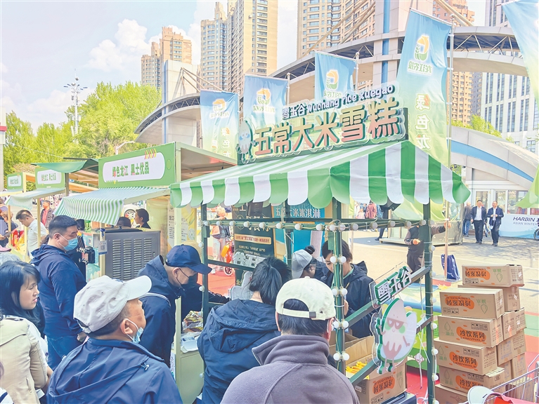 5月18日,“黑土优品”展馆外的集市里,人们在五常大米雪糕摊位前排起了长队,先买到的人迫不及待揭开包装纸,将雪糕送进嘴里,阵阵米香味瞬间充盈了味蕾。