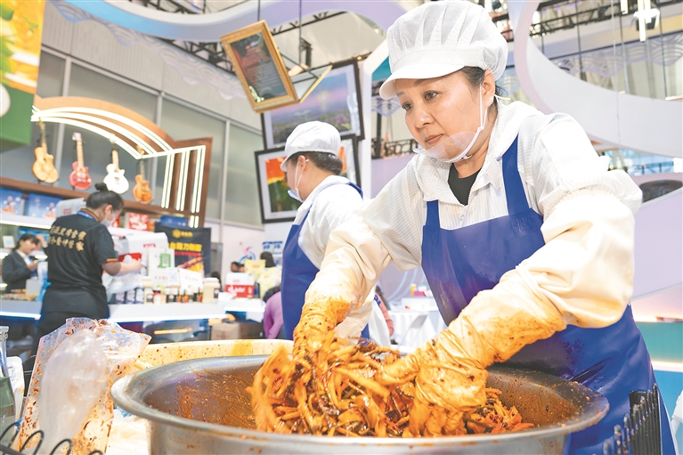 漫步会场,各展区的美食香味不时扑鼻而来,吸引着大家纷纷驻足“恰饭”。记者首先来到齐齐哈尔展区。伴随着“滋啦”的诱人声响,齐齐哈尔烤肉的香味瞬间弥漫开来,吸引了大批观众。现场,工作人员熟练地演示着齐齐哈尔烤肉“拌、烤、蘸”的独特工艺,观众们则排着队,迫不及待地想要品尝这份地道美味。“去了齐齐哈尔好多次,烤肉每次都是必吃的。哈洽会上的齐齐哈尔烤肉,味道真地道,太好吃啦!”观众王萌兴奋地和记者分享道。