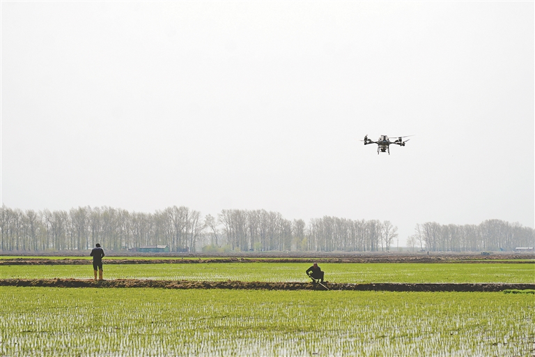 空中,无人机的轰鸣声由远及近。在第二管理区的作业现场,一架植保无人机正展开“叼盘”绝技。“无人机负责‘最后一百米’运输,直接把秧盘放到插秧机上,省了人工搬卸的二次损耗。”农业发展部总经理李海龙介绍,这种“陆空联动”模式在提升秧苗成活率的同时,也提升了工作效率。