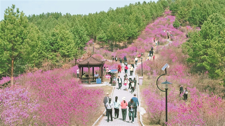 从观景台俯瞰,花径两旁那一簇簇、一丛丛杜鹃花随风摇曳,惹得游人驻足,或拍照留念,或翩翩起舞,尽情享受美景。