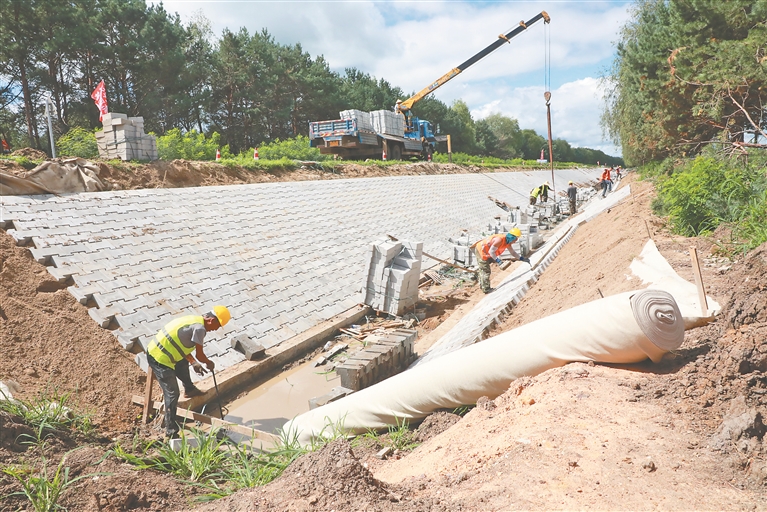 5月27日,在北大荒集团鹤山农场第三管理区侵蚀沟治理现场,一台挖掘机伸展钢铁臂膀,对400余延长米侵蚀沟进行修理平坡,施工队则往石笼网里整齐码放石料。从高空俯瞰,形成坚固的“石笼长城”,抵御水流的强力冲击,守护沟坡稳固。