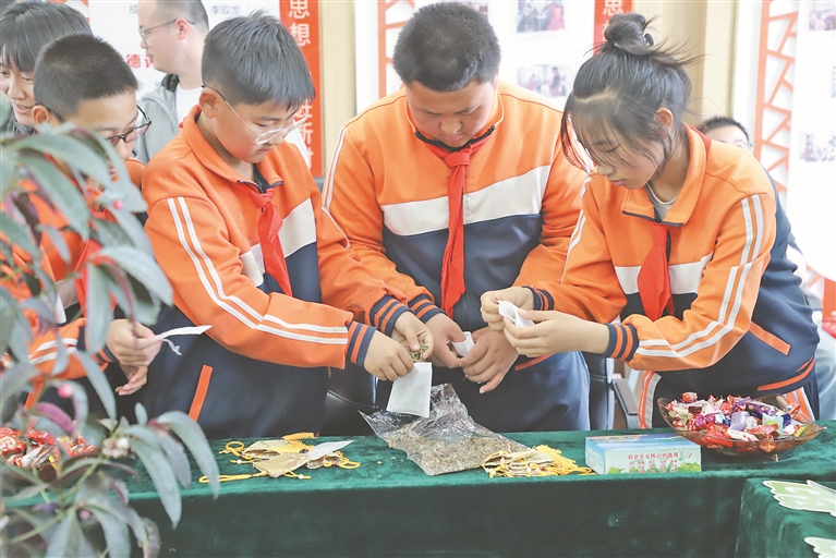 在胜利乡新时代文明实践所,20余名志愿者分工协作,长桌上整齐摆放着五彩丝线、香囊布料、粽叶糯米,等待着村民和孩子们前来体验,现场洋溢着浓郁的节日氛围。