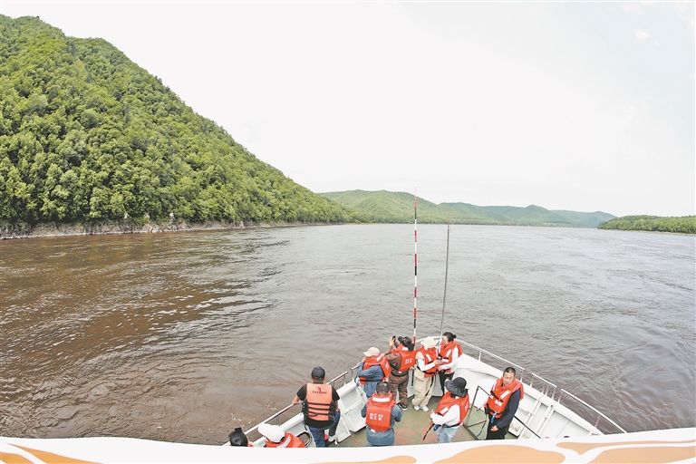 “最美的峡要数金满峡。”船游全段路线导游刘佳慧介绍,金满峡两岸山峰为黑龙江沿线最高——中方海拔298.2米,与俄罗斯对岸海拔272米的山体相映,两山夹江形成险峻而秀美的峡谷风貌。