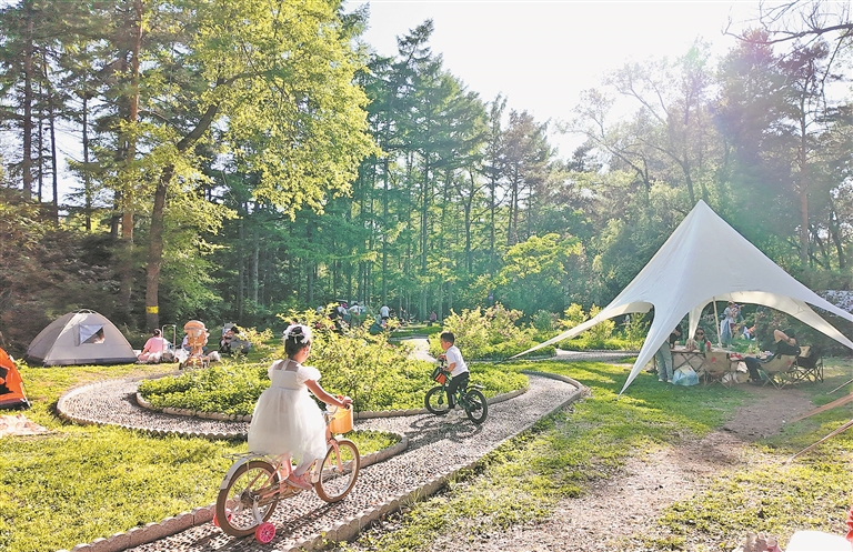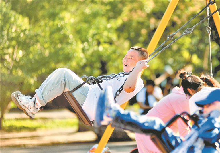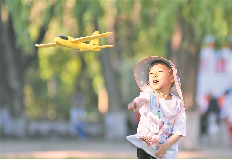 在省森林植物园内,孩子们在草坪上放风筝、吹泡泡、追逐嬉戏,尽情享受假日好时光。