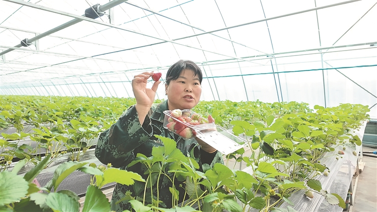 通过“订单驱动+双轨制”产销模式,合作社与地方政府签订长期绿化协议,确保稳定收益,剩余部分直供周边花店。绥东村还申请了乡村振兴项目——高效智能6H大棚。她带着村民去北京学习草莓种植技术,通过不懈努力,现在绥东边境草莓采摘园年产值达22万元。乘着直播助农的东风,村里还开设了红色直播间,销售“绥东甄选”产品,把花卉、草莓、黄瓜、柿子等土特产搬上网络。