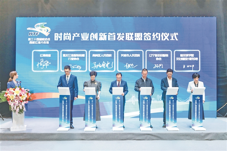 哈尔滨市南岗区人民政府、辽宁省兴城市人民政府、黑龙江省服装鞋帽行业协会、辽宁省纺织服装协会、哈尔滨红博商业等单位,携手黑龙江大学艺术学院、哈尔滨师范大学美术学院、哈尔滨学院文化创意设计研究中心、哈尔滨华德学院艺术与传媒学院、黑龙江三江美术学院等高校,成功签署了《时尚产业创新首发联盟战略合作协议》,以哈洽会为推广窗口,依托西城红场“首发经济”平台,打破地域与行业的壁垒,形成“创意设计、品牌孵化、产业制造、商业渠道、政策支持”的全链条区域经济合作生态,不仅为创意人才提供广阔的就业空间、助力企业实现品牌与制造的双重升级,更为哈洽会注入新活力,成为推动东北时尚产业振兴的强劲引擎。