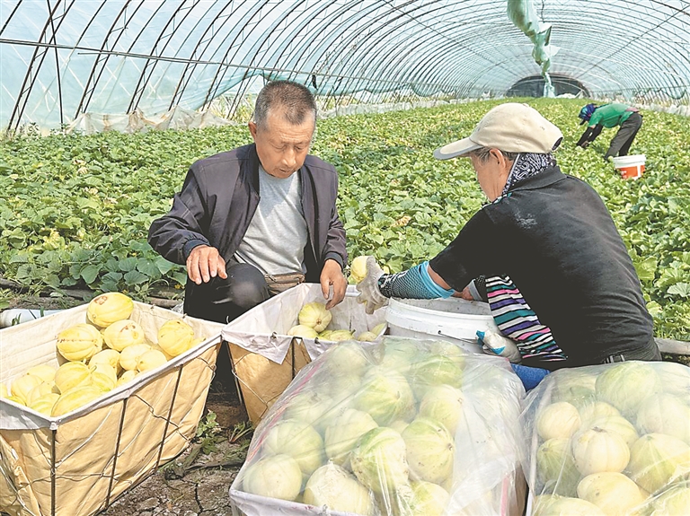 走进大棚,仿佛置身一片绿色海洋,一阵香甜的气息扑鼻而来。农户们穿梭于瓜藤间采摘成熟香瓜,按照形状、甜度划分等级,采摘、分类、装筐、打包,忙得热火朝天。