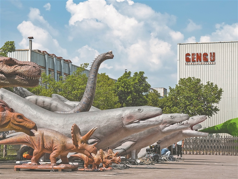 图为2025年6月4日在四川省自贡市自贡亘古龙腾科技有限公司拍摄的即将发往海外的仿真恐龙成品。