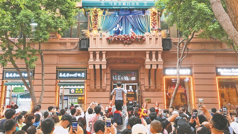马迭尔阳台音乐秀。本报记者 张澍摄