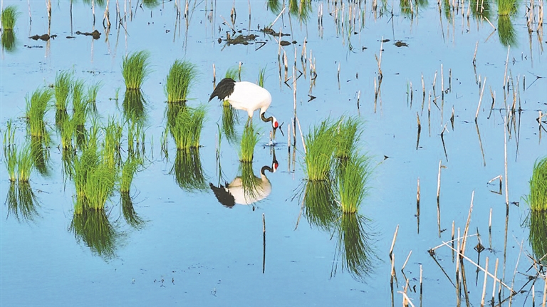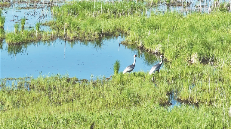 记者了解到,通过持续生态修复,千鸟湖湿地成功逆转了生态退化趋势,栖息地质量显著提升。修复后的湿地记录有维管束植物500种、鸟类89种、兽类25种、鱼类25种,是丹顶鹤、白枕鹤等珍稀物种的重要家园。