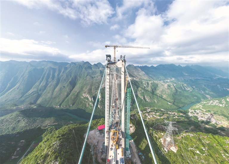 花江峡谷大桥是贵州六安高速公路的控制性工程,全长2890米、桥面距水面高625米,预计今年下半年建成。大桥建成后,将成为世界第一高桥,擦亮中国基建新名片。