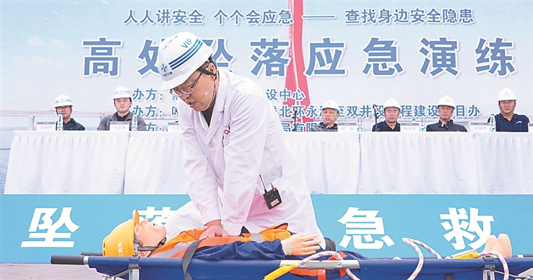 本报9日讯(记者刘心杨)9日,由省公路建设中心主办,中交二航局承办,哈尔滨都市圈环线永源至双井段工程建设项目办协办的哈尔滨都市圈北环项目高处坠落应急演练举行。